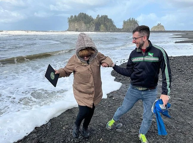 Kevin and Marianne in La Push, WA, out of reach of a Pacific Ocean wave.